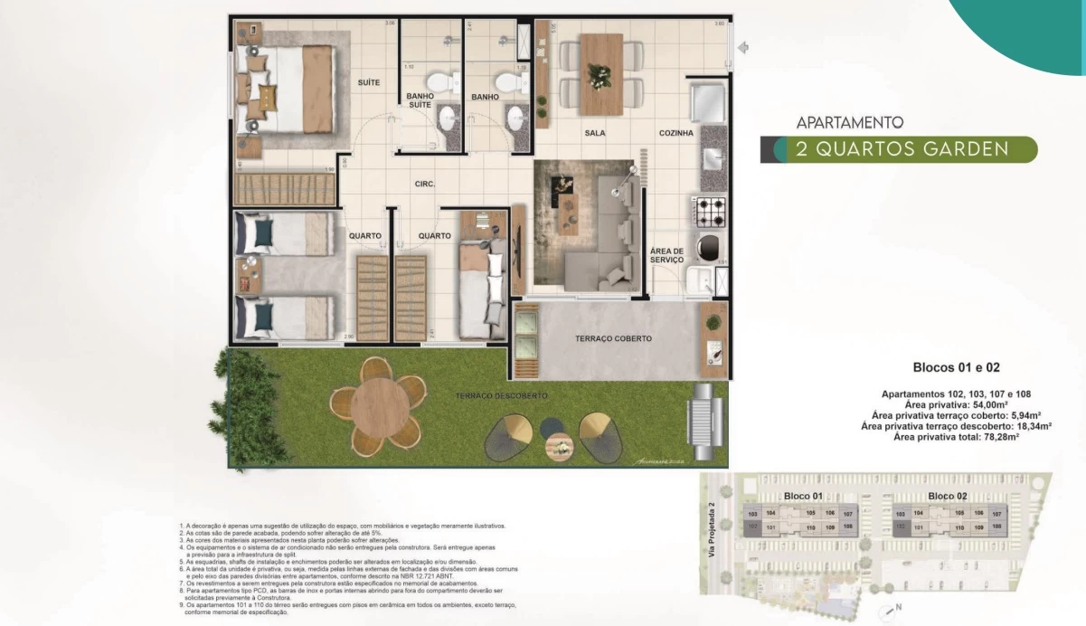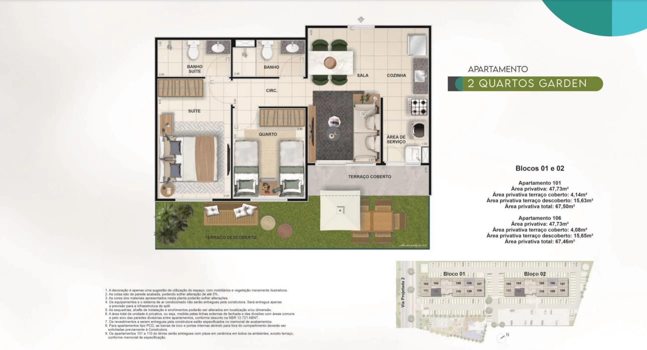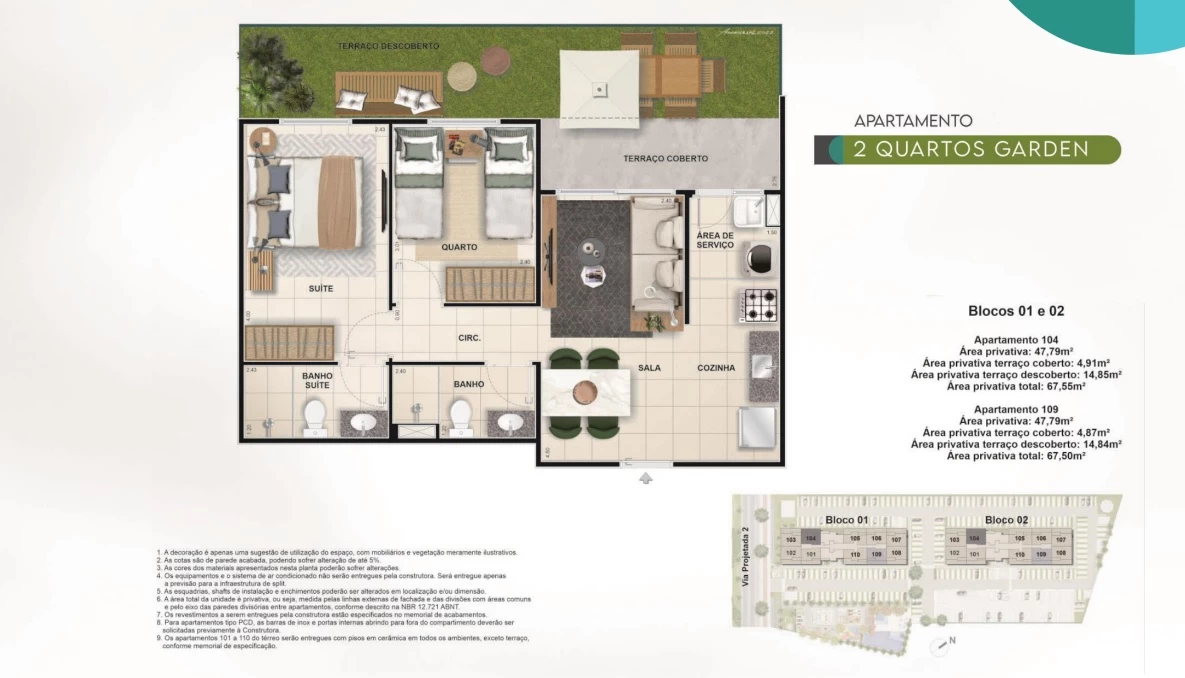 Apartamentos Garden de 2 quartos de 67m² até 78m².