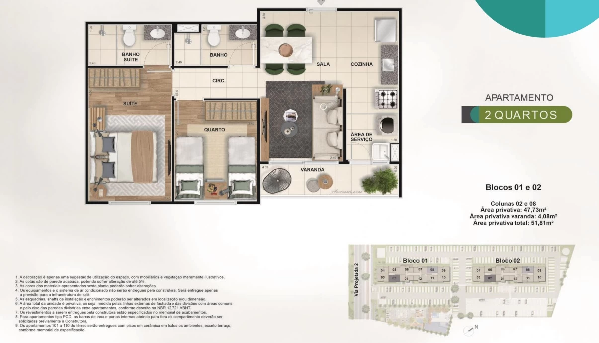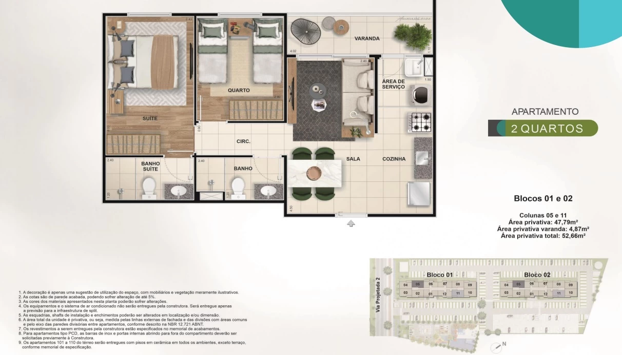 Apartamentos de 2 quartos com 52m².